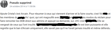 Dans l'ombre, Arcain devient la cible d'une vengeance minutieusement préparée par une dénommée Vic, ainsi que par un second "groupe d'intervention d'élite". Elle use de ses relations avec certains modérateurs du forum Réclamations pour notamment permettre d'appuyer ses nombreuses DDB auprès des administrateurs et garantir un bannissement définitif. Cette vendetta n'est motivée que par une seule raison : faire regretter aux personnes concernées, les nombreuses insultes proférées à son encontre. L'initiative finit par porter ses fruits et Arcain écope d'un bannissement définitif. Vic découvre après coup, qu'Arcain n'est en aucun cas impliqué et exprime plus tard ses regrets concernant le bannissement, mais le mal est déjà fait.