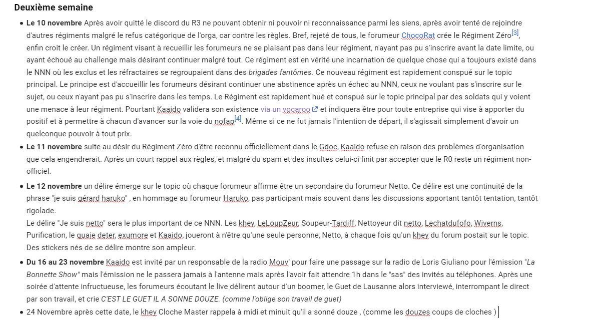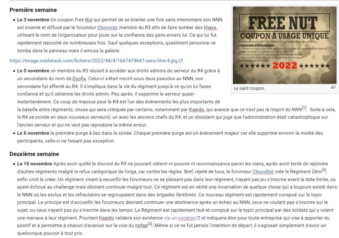 - Le 10 novembre Après avoir quitté le discord du R3 ne pouvant obtenir ni pouvoir ni reconnaissance parmi les siens, après avoir tenté de rejoindre d'autres régiments malgré le refus catégorique de l'orga, car contre les règles. Bref, le forumeur ChocoRat crée le Régiment Zéro[3], enfin croit le créer. Un régiment visant à recueillir les forumeurs ne se plaisant pas dans leur régiment, n'ayant pas pu s'inscrire avant la date limite, ou ayant échoué au challenge mais désirant continuer malgré tout. Ce régiment est en vérité une incarnation de quelque chose qui a toujours existé dans le NNN où les exclus et les réfractaires se regroupaient dans des brigades fantômes. Ce nouveau régiment est rapidement conspué sur le topic principal. . Le Régiment est rapidement hué et conspué sur le topic principal par des soldats qui y voient une menace à leur régiment. Kaaido validera son existence via un vocaroo et indiquera être pour toute entreprise qui vise à apporter du positif et à permettre à chacun d'avancer sur la voie du nofap[4]. Même si ce ne fut jamais l'intention de départ.