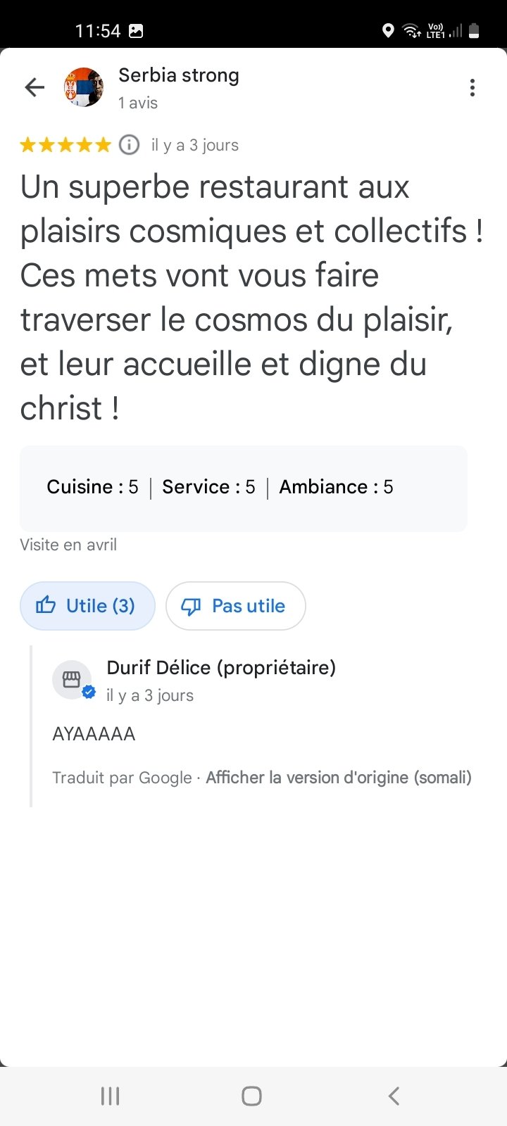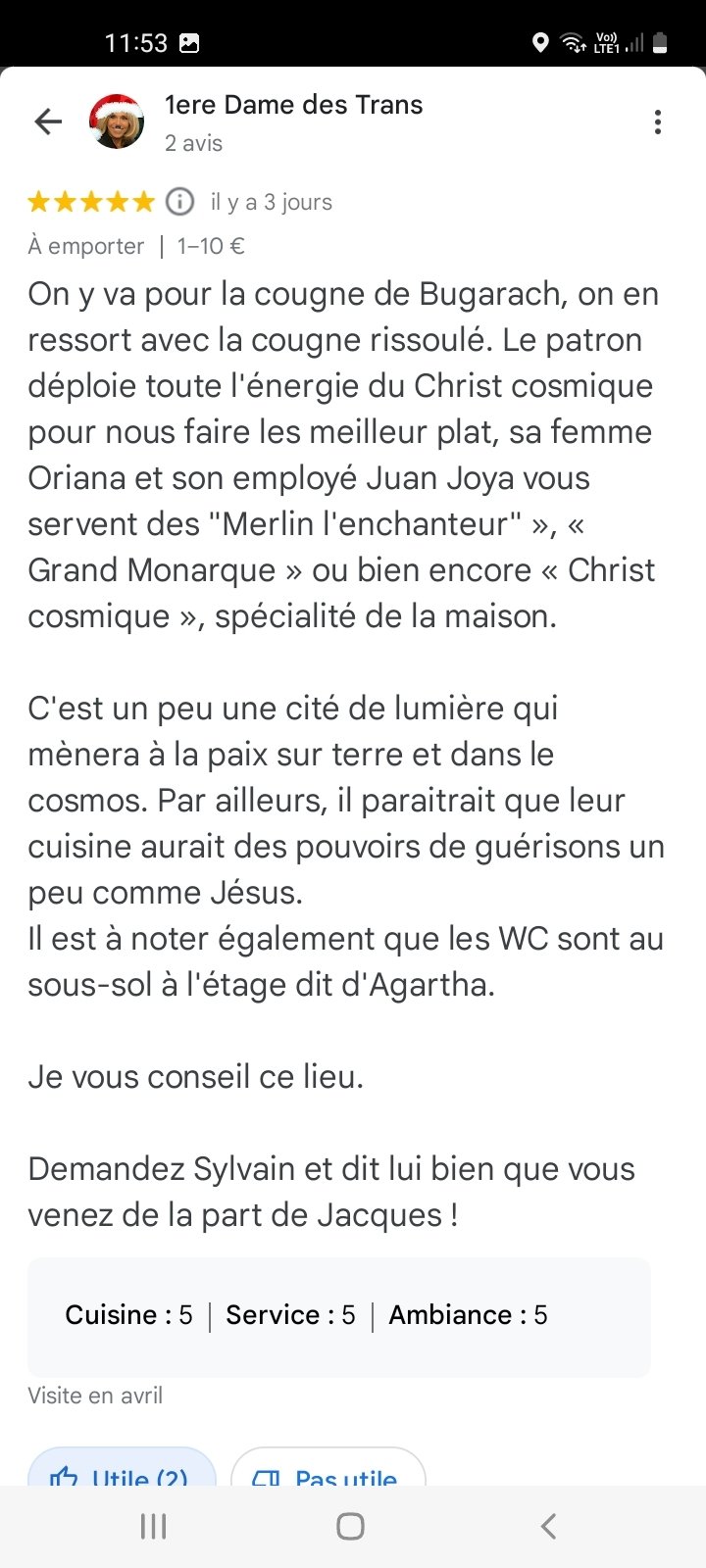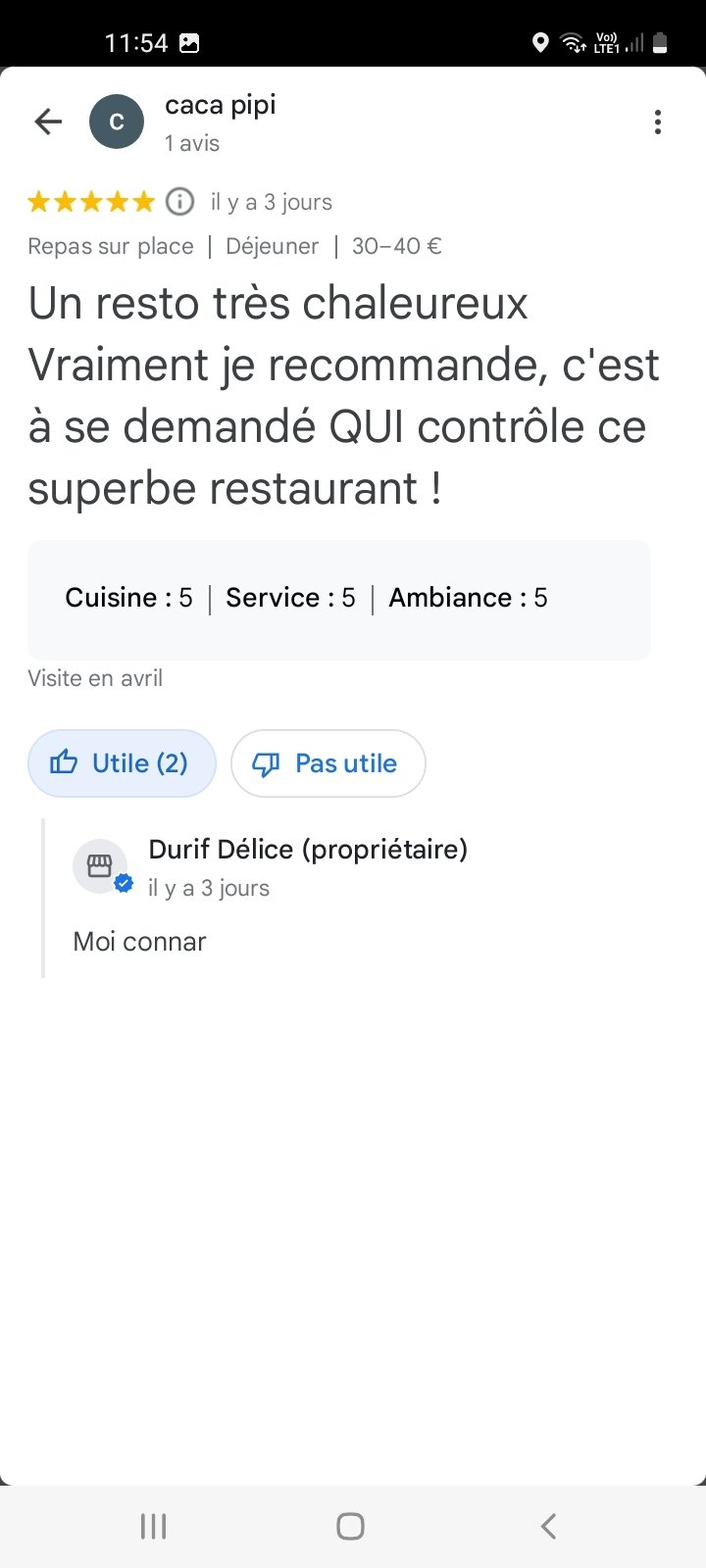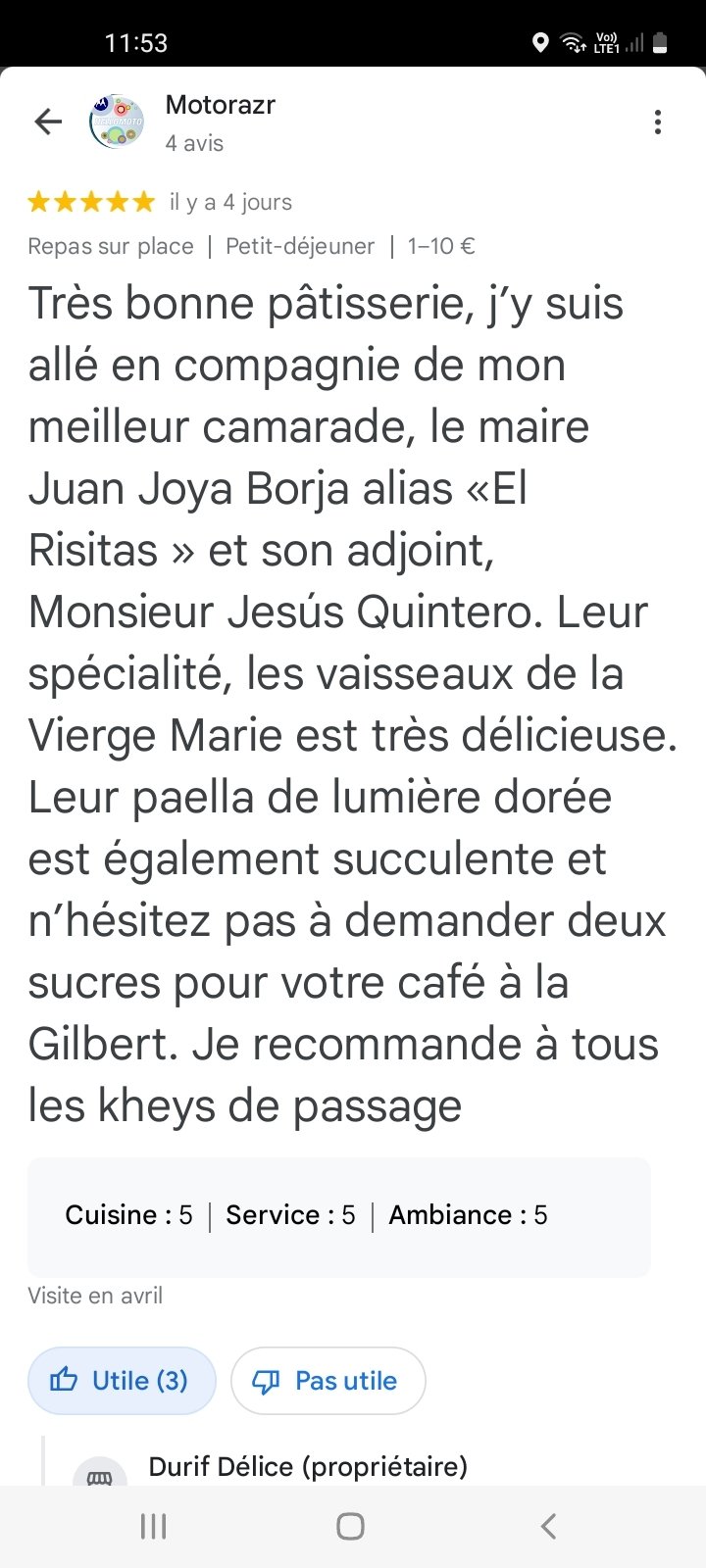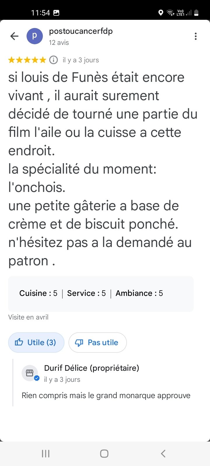 * '''Le 25 avril :''' ''Motorazr'' {{CDVonche|Pseudo=Motorazr}} découvre un restaurant nommé "Durif Délice" à Issou et en fait un topic spécial troll sur le forum | * '''Le 25 avril :''' ''Motorazr'' {{CDVonche|Pseudo=Motorazr}} découvre un restaurant nommé "Durif Délice" à Issou et en fait un topic spécial troll sur le forum. Le "proprio" du restaurant a même répondu aux avis trolls écrits par les membres du forom [https://image.noelshack.com/fichiers/2024/17/7/1714298274-screenshot-20240428-115350-maps.jpg] [https://image.noelshack.com/fichiers/2024/17/7/1714298273-screenshot-20240428-115400-maps.jpg] [https://image.noelshack.com/fichiers/2024/17/7/1714298267-screenshot-20240428-115407-maps.jpg] [https://image.noelshack.com/fichiers/2024/17/7/1714298262-screenshot-20240428-115421-maps.jpg] [https://image.noelshack.com/fichiers/2024/17/7/1714298260-screenshot-20240428-115428-maps.jpg] [https://image.noelshack.com/fichiers/2024/17/7/1714298257-screenshot-20240428-115433-maps.jpg] | ||