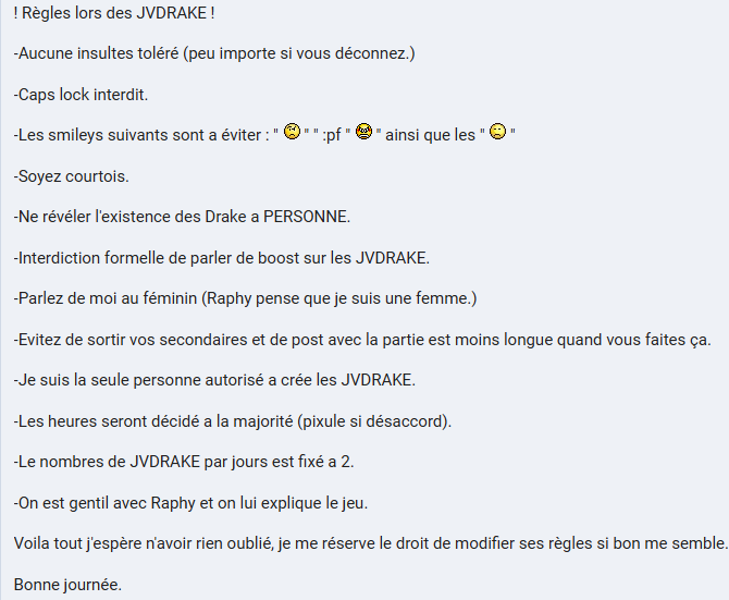 [[Fichier:deux jvdrake par jour.webp|vignette|301x301px|''Raphy55'' autorisant deux parties de JVDrake journalières.]] | |||