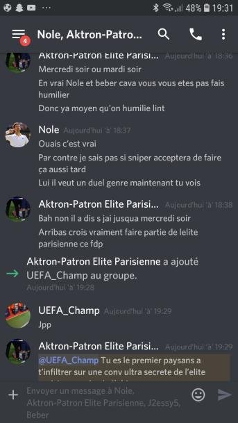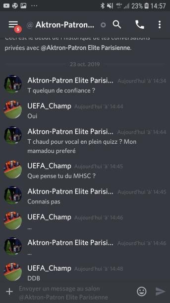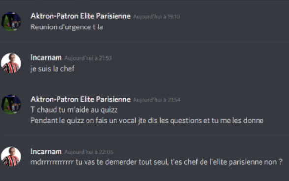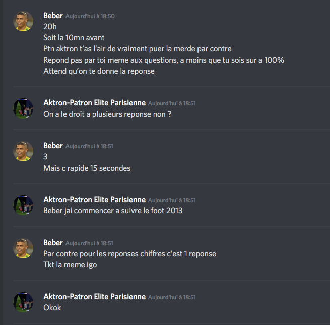Le même jour : dans le cadre du Quiz du FF première édition [74], les forumeurs ReLint & Aktron se retrouvent en duel en seizième de finale. Le duel est filmé et commenté par le forumeur lasnlleretour [75]. Il va être remporté par ReLint sur le score de 13-6. Suite à cette victoire, dans un premier temps, "l'élite parisienne" du forum va crier au complot et à la triche vis à vis de sniper8495 et ReLint. Mais suite à une infiltration du forumeur UEFA_Champ au sein de cette "élite parisienne" (groupe privé sur discord), il sera prouvé à l'aide de screens qu' Aktron a tenté à plusieurs reprises de tricher lors de ce quizz avec la complicité de Beber notamment. Cela va provoquer une exposition de "l'élite parisienne" qui sera dissoute immédiatement suite à la désolidarisation de chacun des membres envers Aktron. Beber reprocha à Aktron sa tixerie de ne pas connaître des réponses aux questions plus que facile.