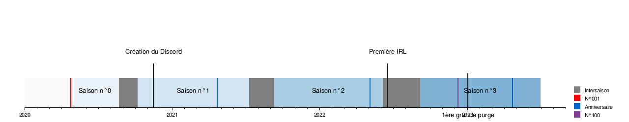 bar:A color:dates from:15/11/2020 till:15/11/2020 shift:(0,80) text:"Création du Discord" | |||