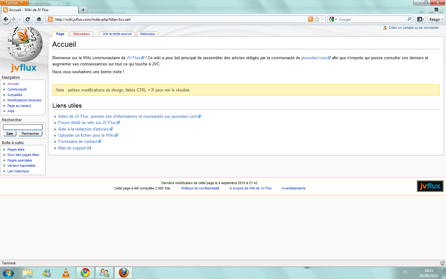 - 2 juillet: Révision de toutes les pages officielles du wiki. Désormais la page À propos devient la page centrale des renseignements sur JVFlux. Légère révision de la page d'accueil en conséquence, ajout d'un encart Fichier du moment. Réorganisation de la sidebar à gauche.