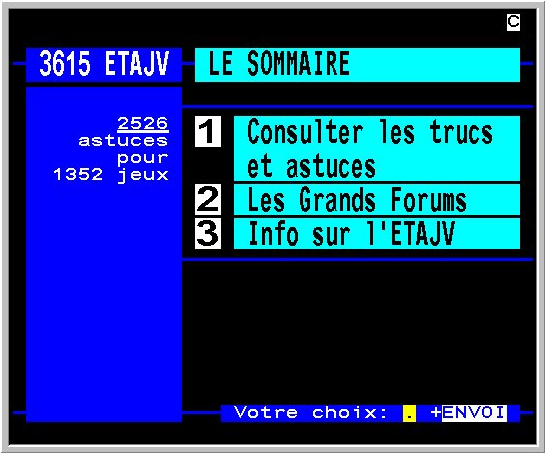 Révision datée du 5 décembre 2013 à 04:10 par Lightman (discussion | contributions) (Design de 3615 ETAJV. Source : http://www.jeuxvideo.com/dossiers/00011660/les-debuts-de-jeuxvideo-com-le-3615-etajv-et-les-debuts-sur-le-web-002.htm http://image.jeuxvideo.com/imd/m/minitel_3615_etajv_2.jpg)