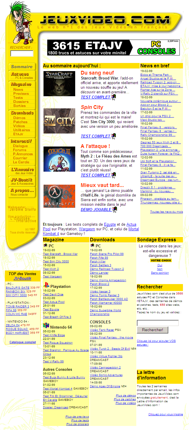 Révision datée du 5 décembre 2013 à 04:30 par Lightman (discussion | contributions) (Jeuxvideo.com en septembre 1998. Source : http://www.jeuxvideo.com/dossiers/00011660/les-debuts-de-jeuxvideo-com-1998-a-1999-apparition-des-tests-005.htm Fichier : http://image.jeuxvideo.com/imd/j/jv1998_1999.jpg)